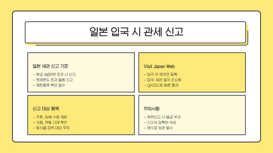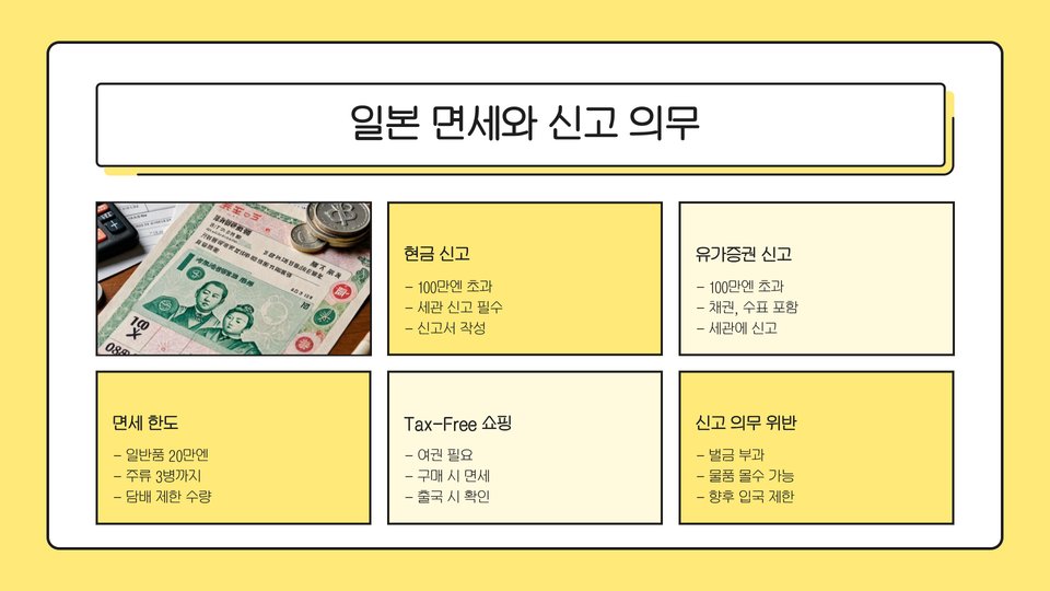 일본은 특히 문화재와 예술품에 대한 규제가 강하므로, 해당 물품을 반입할 경우 사전에 확인해야 합니다. 관세 신고를 통해 불필요한 문제를 피하는 것이 중요합니다.