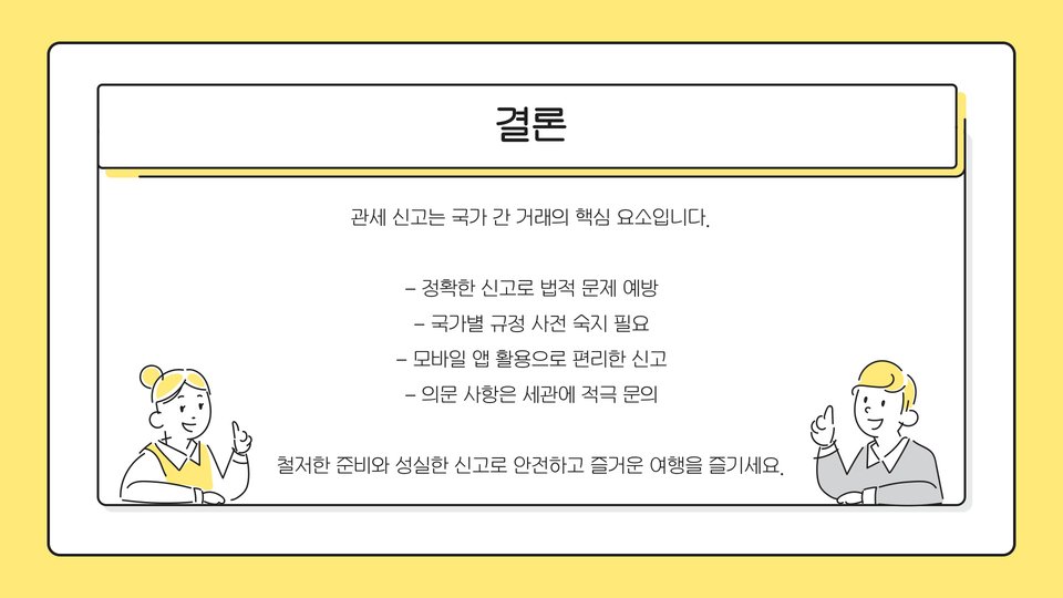 결론적으로, 관세 신고는 모든 여행자와 수출입 기업이 지켜야 할 절차입니다. 따라서 이를 정확히 이해하고 준비하는 것이 필요합니다.