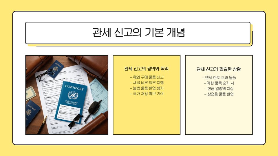 관세 신고란, 개인이나 기업이 국경을 넘는 물품에 대해 세금을 납부하기 위해 정부에 알리는 절차입니다. 이것은 국가가 외국에서 들어오는 물품에 대해 정해진 세금을 부과하고, 국내 시장을 보호하는 역할을 합니다. 각 나라마다 관세의 종류와 세율이 다르기 때문에, 정확한 정보가 필수적입니다. 관세 신고는 또한 법적으로 의무 사항이므로, 이를 무시할 경우 법적 처벌을 받을 수 있습니다.