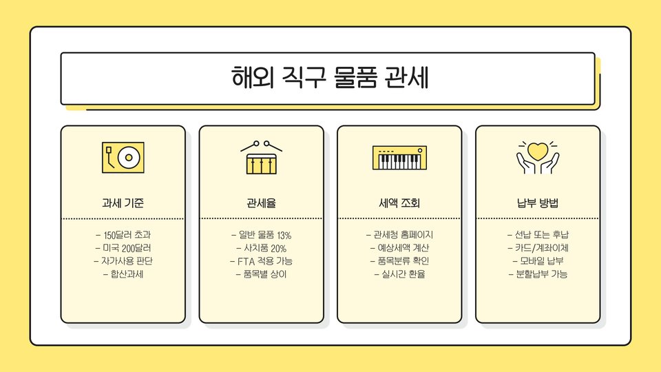 관세 신고를 위해서는 먼저 물품의 종류와 가치를 파악해야 합니다. 관세청 웹사이트에서는 다양한 물품의 세율을 확인할 수 있습니다. 신고서 작성 시, 물품의 구체적인 정보와 가격을 기재해야 하며, 영수증을 포함하는 것이 좋습니다. 이는 신고 과정에서의 불필요한 문제를 예방하는 데 도움이 됩니다.