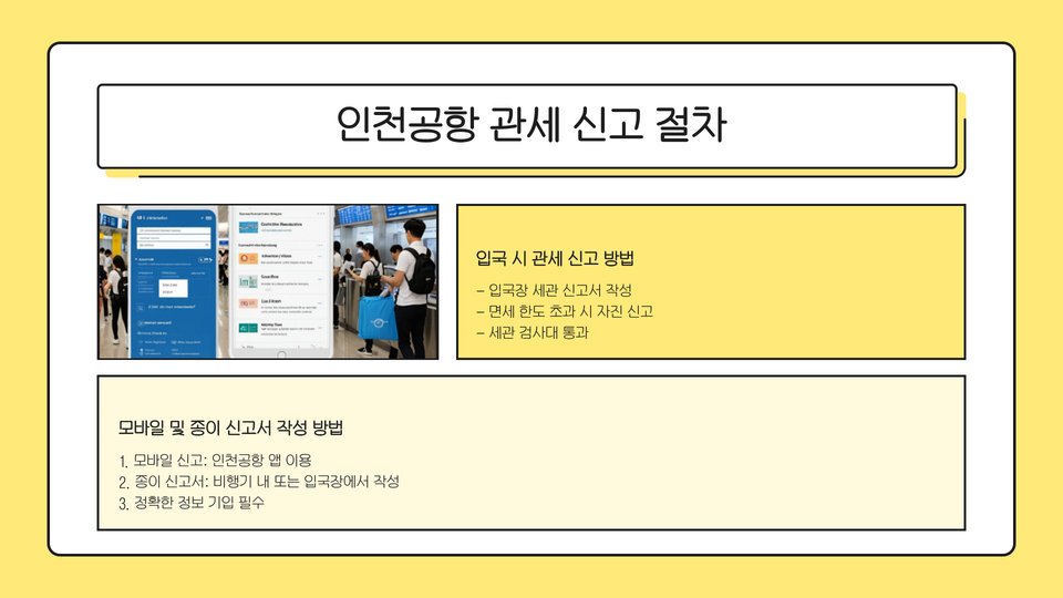 인천공항에 도착하면, 관세 신고는 필수입니다. 면세 범위를 초과하는 물품이나 금액이 있을 경우, 반드시 신고해야 합니다. 기본적으로 개인이 소지할 수 있는 면세 한도는 600달러이며, 이 범위를 초과하면 세금을 납부해야 합니다.