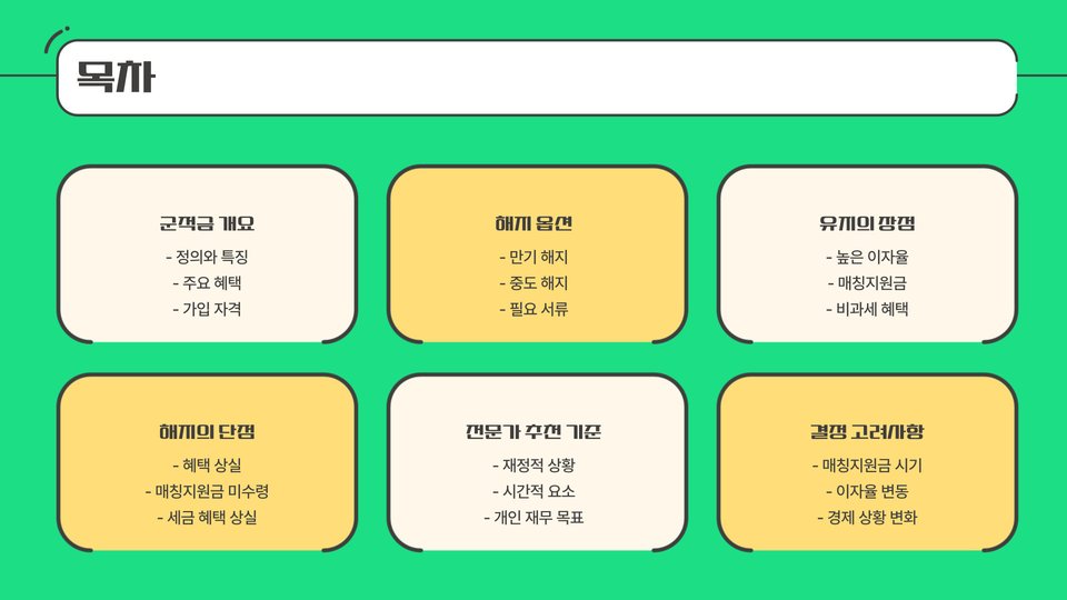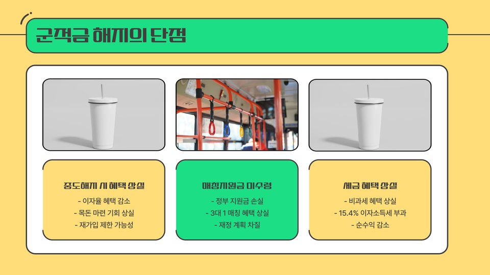 - 군적금 해지 또는 유지는 개인의 재정 상황에 따라 결정해야 한다.