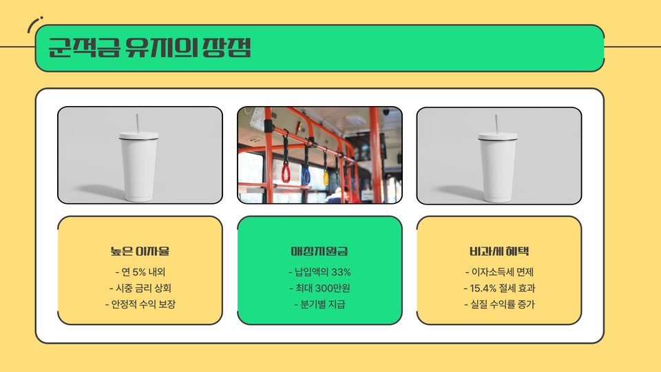 군적금을 계속 유지하는 것은 장기적으로 더 많은 이익을 가져올 수 있습니다. 군복무가 끝날 때까지 유지한다면 이자 소득과 재정 지원금을 동시에 받을 수 있습니다. 이는 특히 전역 후의 경제적 부담을 덜어줄 수 있는 큰 장점입니다.