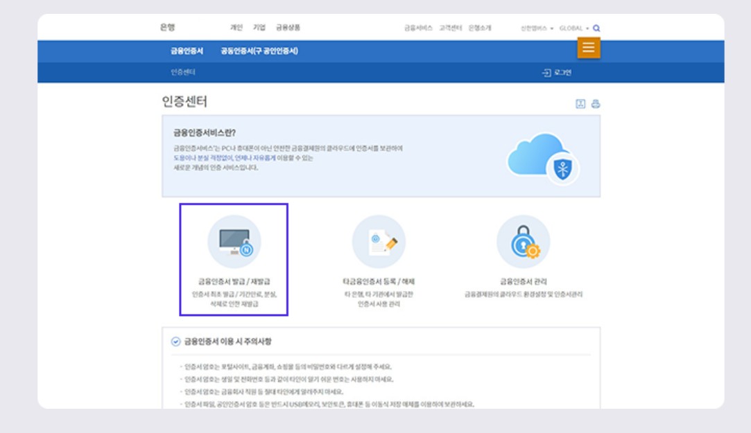 표에 있는 링크를 클리하면 해당 은행 금융인증서 발급 페이지로 이동 합니다.