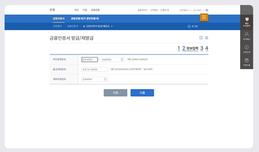 2.신원확인 단계로 주민번호, 계좌번호, 보안카드 등으로 신원 확인 단계를 진행 합니다.