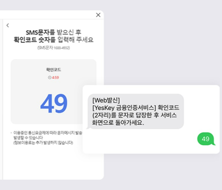4.금융인증서비스 화면에 나타난 확인코드를 수신된 문자에 입력 하고 전송 합니다.