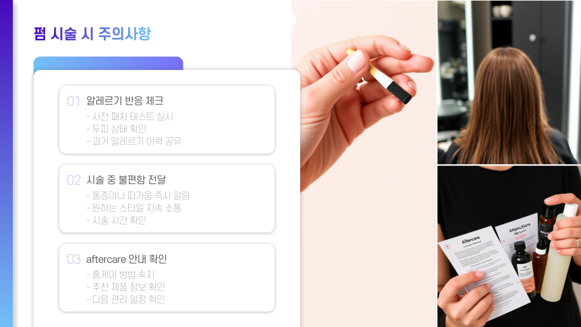 둘째, 본인의 피부 타입과 두피 상태를 확인하는 것이 좋습니다. 피부 자극이 있을 경우, 펌 화학제가 더 자극을 줄 수 있으며, 이는 두피 건강에 좋지 않은 영향을 미칠 수 있습니다. 펌을 진행하기 전에는 반드시 전문가와 상의하는 것이 중요합니다.