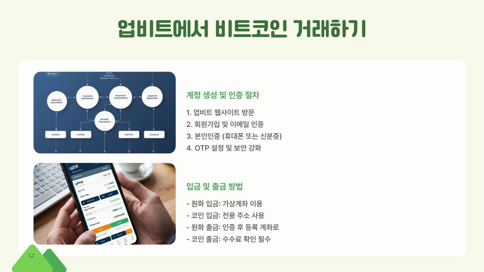 업비트에서 비트코인을 거래하려면 먼저 계정을 개설해야 하며, KYC(고객 확인 절차)를 통해 본인 인증을 받는 과정이 필요합니다. 계좌 개설 후에는 비트코인을 구매하기 위해 원화를 입금한 후, 원하는 시점에 거래를 진행할 수 있습니다.