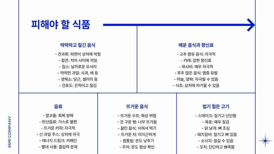특히 신선한 과일이나 견과류 등은 자극적일 수 있으므로 주의해야 합니다. 또한은 음식을 씹을 때에는 잇몸에 압력이 가해지지 않도록 조심하며, 필요한 경우에는 믹서로 음식을 갈아서 섭취하는 것도 좋은 방법입니다.