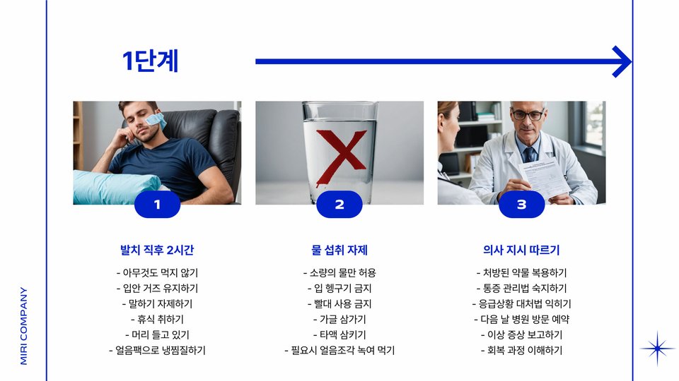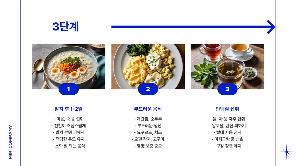 처음에는 물이나 투명한 육수를 섭취할 수 있습니다. 이후에는 천천히 다른 식사를 계획해도 좋습니다. 특히 찬 음료가 잇몸을 진정시킬 수 있으므로, 음료를 선택할 때 꼭 고려해보세요.