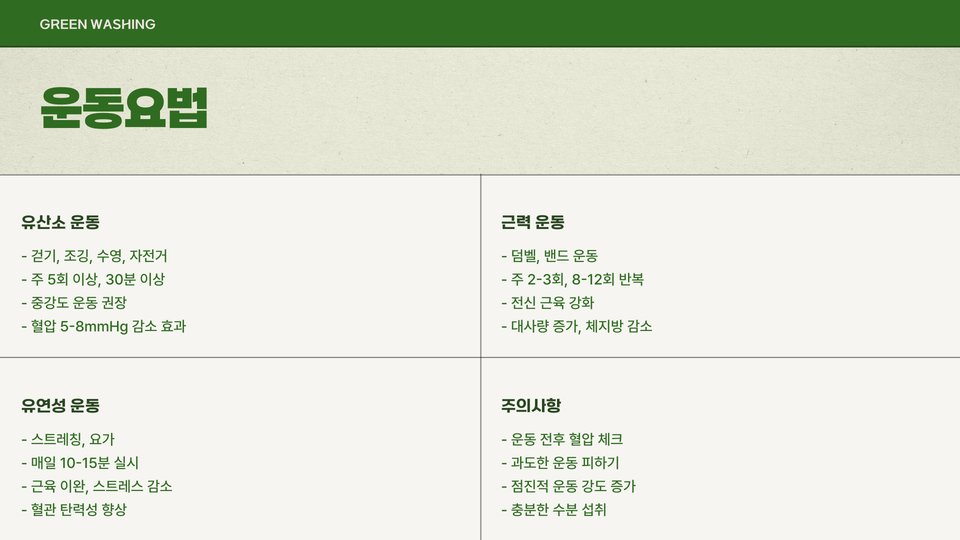 운동은 혈압을 낮추는 데 가장 효과적인 방법 중 하나입니다. 일주일에 최소 150분의 중간 강도의 유산소 운동을 권장합니다. 빠르게 걷기, 자전거 타기, 수영 등이 좋은 예입니다. 운동을 통해 심혈관 기능이 개선되고, 스트레스가 감소하여 혈압 조절에 도움을 줍니다. 매일 30분씩 걷는 것만으로도 혈압을 효과적으로 낮출 수 있습니다.