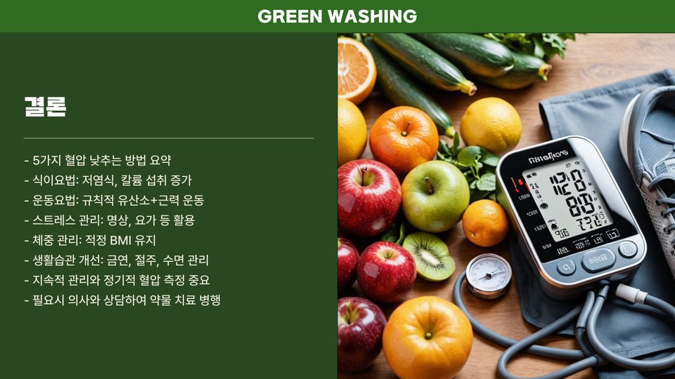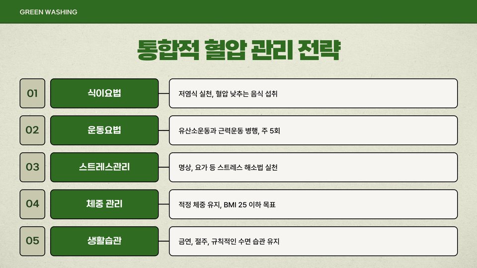 위에서 제시한 다섯 가지 방법은 혈압을 성공적으로 낮추고 관리하는 데 실질적인 도움이 될 것입니다. 건강한 생활 습관을 통해 혈압을 효과적으로 관리하여 건강한 삶을 유지해 나가시기 바랍니다.