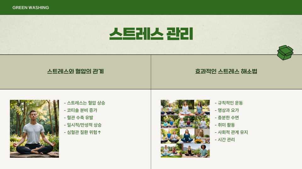 스트레스는 혈압을 상승시킬 수 있는 큰 요인 중 하나입니다. 따라서, 효과적인 스트레스 관리 방법을 찾는 것이 중요합니다. 마음을 진정시키고 편안한 상태를 유지하려면 명상이나 심호흡과 같은 이완 기법을 활용해보세요. 매일 몇 분이라도 스트레칭이나 마음챙김을 통해 자신의 마음을 다스리는 것이 유익합니다.