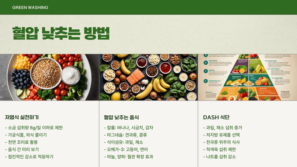 혈압을 낮추기 위해서는 소금 섭취를 줄이는 것이 필수적입니다. 높은 나트륨 섭취는 혈압을 높이는 주요 원인 중 하나입니다. 소금 대신 허브와 향신료를 활용하여 맛을 내는 것이 좋습니다. 또한, 과일과 채소를 충분히 섭취하고, 정제된 탄수화물 대신 통곡물을 선택하는 것이 혈압 조절에 도움이 됩니다.