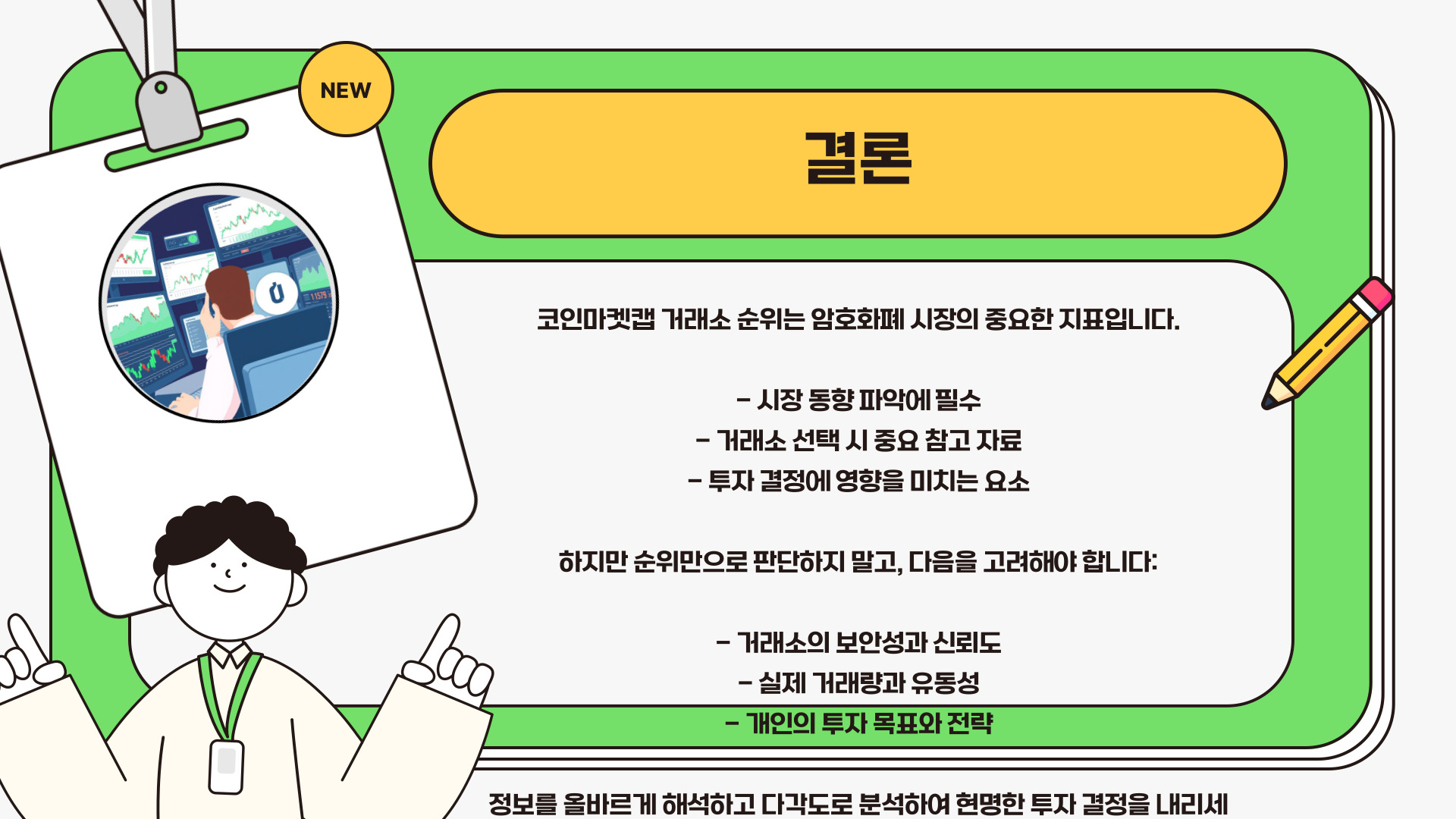 코인마켓캡 거래소 순위는 암호화폐 거래에서 매우 중요한 요소입니다. 높은 순위를 가진 거래소 사용은 안정성, 유동성, 그리고 다양한 암호화폐 거래 기회를 제공합니다. 따라서 거래소 선택 시 코인마켓캡의 정보를 항상 참고하고, 자신의 투자 스타일에 맞는 거래소를 선택하는 것이 필요합니다. 이러한 과정을 통해 보다 안전하고 효율적인 거래를 경험할 수 있습니다.