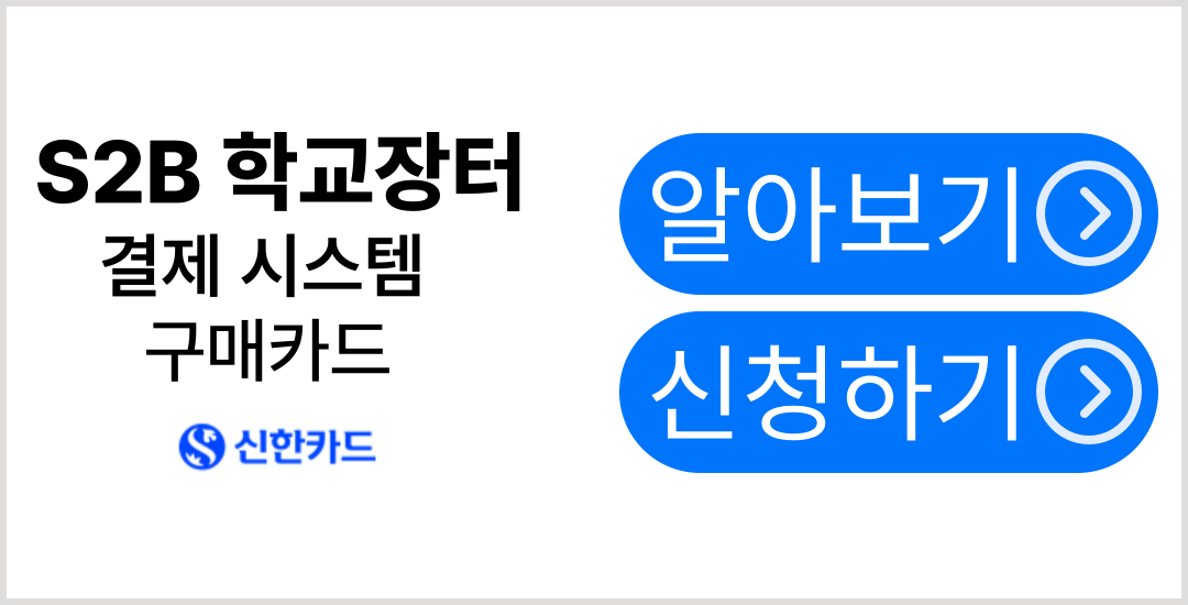 학교장터에서 결제 시스템으로 사용되는 '구매카드'는 신한카드에서 사용되는 카드로 공급업체로 등록된 사업체는 신한카드 가맹점으로 가입이 되어 있어야 학교장터에서 거래가 가능합니다.