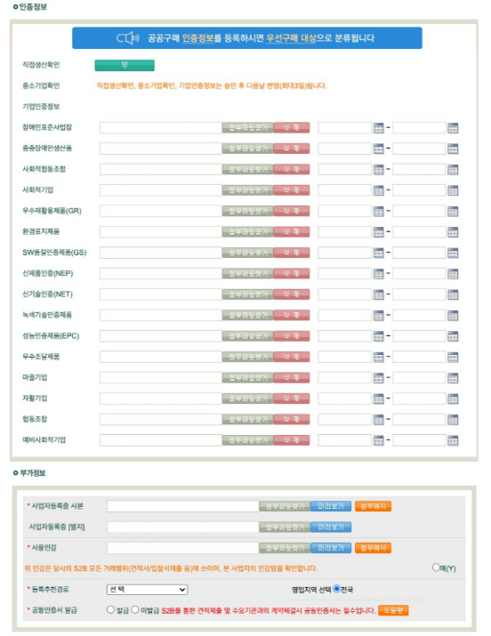 4. 사업체가 보유한 인증들을 입력 합니다. 인증이 있으면 입찰 시 우대되는 것들이 있으니 모두 입력하시기 바랍니다.