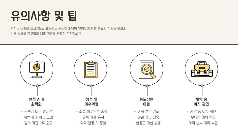 학자금 대출을 고려하는 학생들은 이를 통해 더 나은 기회를 얻을 수 있지만, 그 만큼 책임도 뒤따르는 법입니다. 그렇므로 대출 내용을 정확히 이해하고, 사전 준비를 철저히 하는 것이 중요합니다. 그러므로 아래의 정보를 참고하시기 바랍니다.