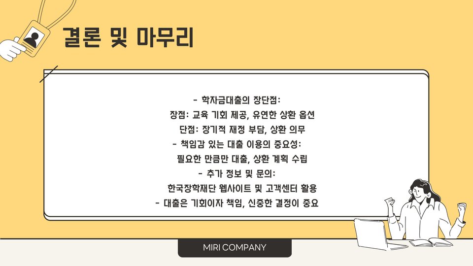 결론적으로, 취업 후 상환 학자금 대출 제도는 단순히 개인의 재정 문제를 해결하는 것을 넘어 학업을 지속할 수 있는 기회를 제공합니다. 많은 대학생들이 이 제도를 통해 교육의 기회를 얻고, 경제적 자립을 이룰 수 있었습니다. 따라서, 이 제도의 지속적인 발전과 학생들의 현명한 선택이 함께 이루어지길 바랍니다.