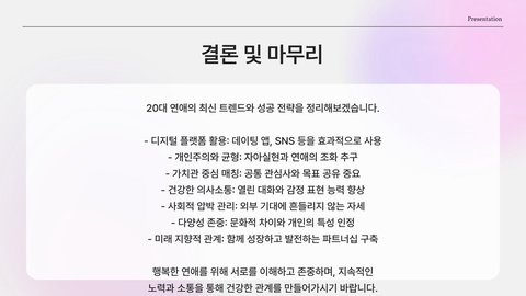 그러므로 이러한 요소들을 지속적으로 반영하며 연애를 즐기십시오. 20대 연애의 트렌드를 한 발짝 먼저 이해하고, 당당한 자신감을 가지고 사랑을 찾아 나선다면, 훌륭한 연애를 만날 가능성이 높아질 것입니다.