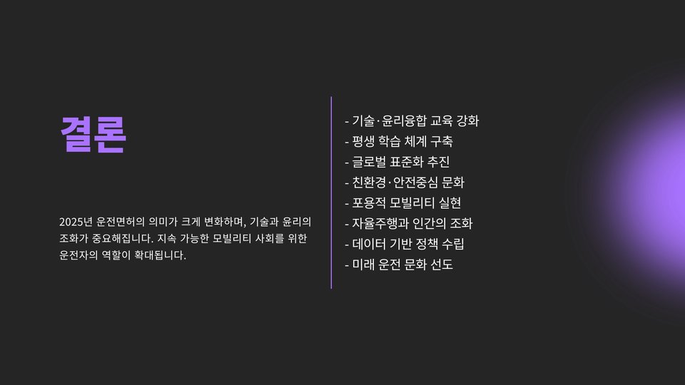 2025년 운전면허 과정은 디지털화, AI 기반 교육, VR/AR 기술 활용, 친환경 교육 등 다양한 트렌드로 변화할 것입니다. 이러한 변화들은 학생들에게 더 나은 교육 경험을 제공하고, 안전한 운전 문화를 만드는 데 기여할 것으로 기대됩니다.