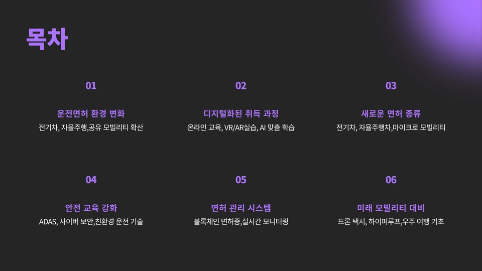 2025년 운전면허 과정은 디지털화, AI 기반 교육, VR/AR 기술 활용, 친환경 교육 등 다양한 트렌드로 변화할 것입니다. 이러한 변화들은 학생들에게 더 나은 교육 경험을 제공하고, 안전한 운전 문화를 만드는 데 기여할 것으로 기대됩니다.