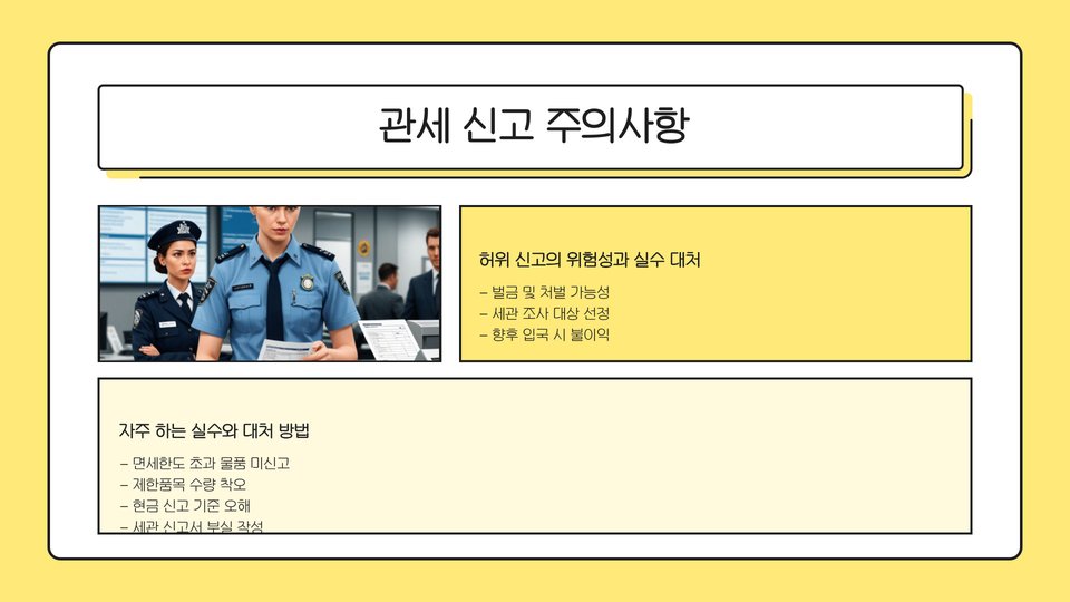 중요 팁: 관세 신고는 항상 정직하게 진행해야 하며, 허위 신고는 법적 처벌을 받게 됩니다.