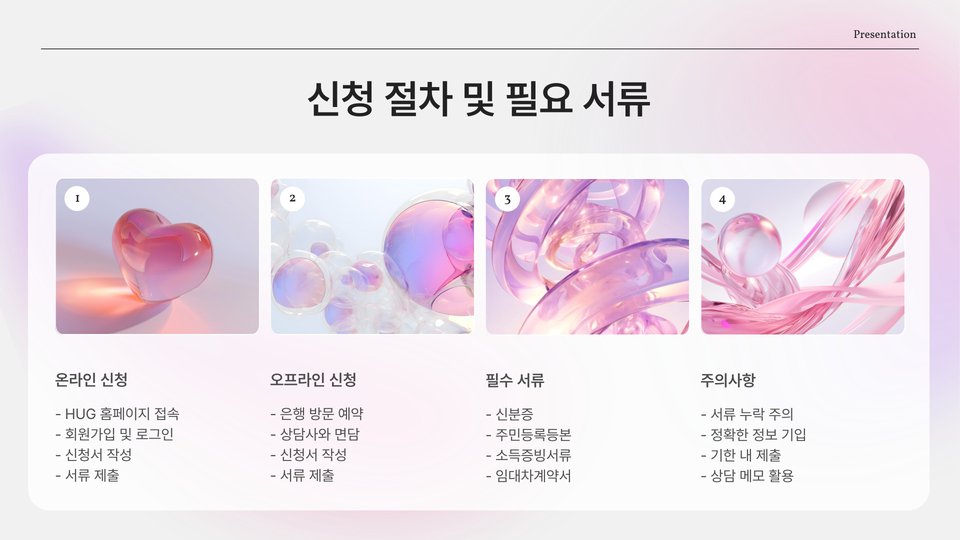 - 신청은 HUG 홈페이지를 통해 가능하며, 필요한 서류를 사전 준비해야 합니다.