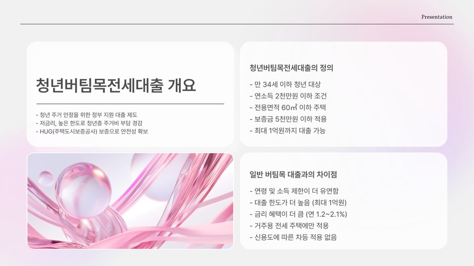 청년버팀목전세대출은 19세 이상 39세 이하의 청년들이 전세 보증금을 마련하는 데 필요한 대출 상품입니다. 이 대출은 정부와 HUG의 지원을 받아 이자 부담을 줄여주고, 보다 안정적인 주거 환경을 제공하는 것을 목표로 합니다. 대출 한도는 최대 2억원이며, 대출 금리는 연 0.5%에서 1.5%로 매우 저렴한 편입니다. 청년들의 주거 안정성을 높이는 데 큰 도움이 되고 있습니다.