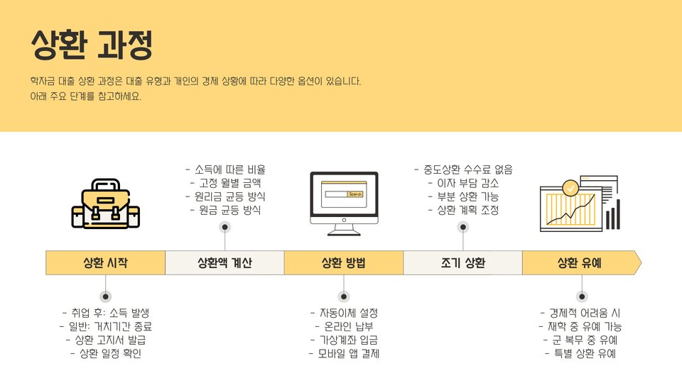 - 졸업 후 6개월 이후 상환이 시작되며, 소득에 따라 상환액 달라짐.